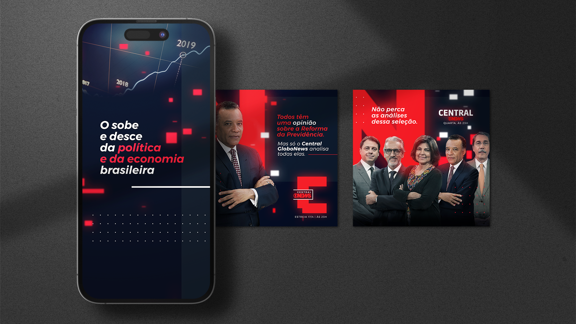 Direção de arte para a campanha Central Globonews. Key visual e peças para social, além de vinhetas.
